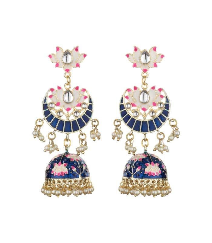 These are the latest addition to our Bollywood range. These are our designer navy blue Meenakari Kundan Jhumki’s. The top has a lotus flower from which dangles a larger lotus with a navy blue skirt with a bell completing the entire ring. The bell is surrounded by tiny little peals by contrast.